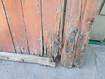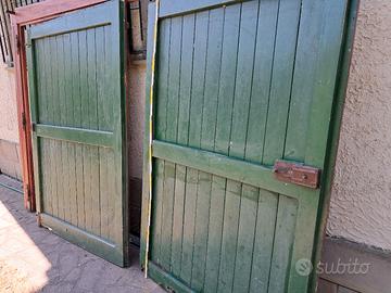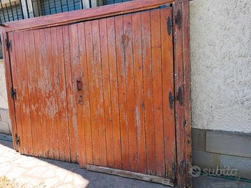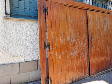 porta 2 ante usata in legno da esterno, era in un garage, misura di altezza massima cm.196, altezza senza la battuta cm.193, lunghezza totale delle due metà accoppiate cm.270 circa, spessore totale cm.5, spessore delle doghe cm.2, ha anche la cornice di sostegno formata dalle due colonne verticali alle quali sono attaccate le cerniere e dal traverso superiore, nella porta nella parte inferiore il legno è marcito in particolare nell angolo inferiore destro in questa zona occorre la sostituzione del pezzo di legno, nell insieme può essere ripristinata anche con una levigatura e verniciatura con smalto nella parte interna e con impregnante in quella esterna, vendo a euro 270, date le dimensioni non spedisco ritiro solo di persona