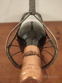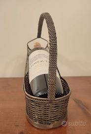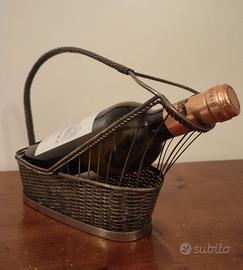 Porta bottiglie, wine cradle, in metallo argentato anni '70, vintage autentico con gusto retrò. Modello a "intreccio" di artigianato industriale di alto livello. Manico con lavorazione a spirale e bordo superiore "a cordone". Base solida con buona stabilità con etichetta Silver plated tipica degli anni '50-'70. Misure: lunghezza 30x altezza 22 x prof 19. Peso 456 gr.