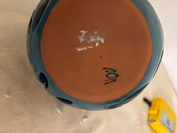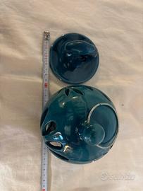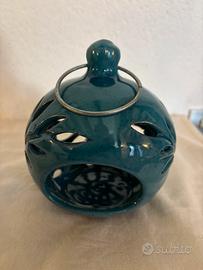 portacandela da parete decorativo o una lanterna in ceramica, smaltata in una tonalità di verde acqua o turchese. Questi oggetti sono tipicamente progettati per contenere una candela tealight o piccola, la cui luce filtra attraverso i ritagli decorativi a forma di petalo, creando un'atmosfera suggestiva.