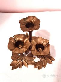 Porta candele in ottone vintage (anni 60 circa) in ottone a tre bracci composto da tre fiori legati insieme a diverse altezze e base di foglie. In perfetto stato.
