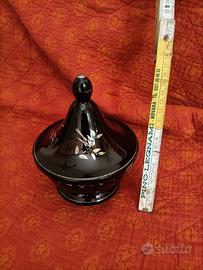 Porta caramelle in vetro viola e decorazioni in argento, dimensioni indicate in fotografia. Non presenta imperfezioni.
