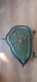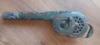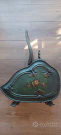 Antico mantice a manovella del XIX secolo brevettato da Alex Clark e un contenitore in metallo verde porta carbone prodotto dalla Deane & Co London Bridge presenta decorazioni con finiture e dettagli dorati,ha una maniglia superiore in ghisa lavorata, un vano porta-paletta sul retro e piedini a ruota in ghisa. Internamente è presente un contenitore rimovibile per facilitare lo smaltimento del contenuto.