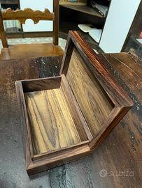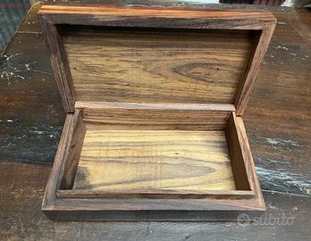 Contenitore per carte da gioco in legno di rosa (prodotto artigianale indiano) con decori in ottone; dimensioni: cm. 18x10 altezza 5 cm.
