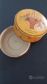 Delizioso portacipria antico – vintage in cartone, manifattura Houbigant, Parigi, bella grafica in stile Art Dèco caratterizzata da un cesto di fiori sopra una base di colore giallo che simula un intarsio in legno.