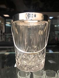 Porta ghiaccio in cristallo lavorato della "RCR" , vintage, con manico ed elementi in metallo argentato e completo di pinza in acciaio inox. Perfette condizioni, come nuovo, nessun difetto. Diametro massimo 11cm, altezza 15cm manico escluso, pinza lunga 15cm circa. (disponibili servizi bicchieri stessa serie in annuncio separato)