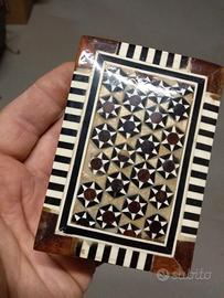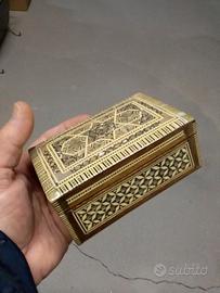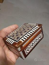 2 porta gioie in legno lavorate a mosaico e madreperla, interno in velluto rosso.