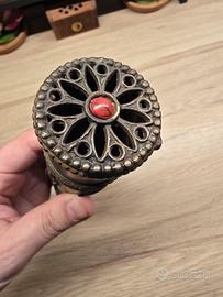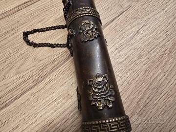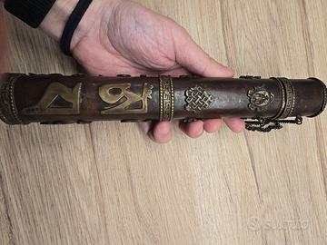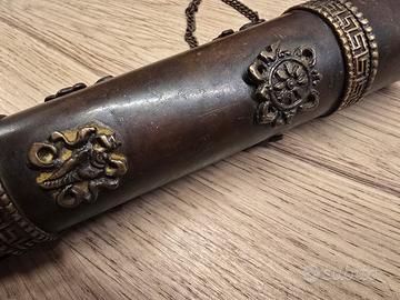 Questo affascinante porta incensi a tubo non è un semplice contenitore, ma un piccolo compendio di spiritualità himalayana che racchiude nei suoi dettagli metallici secoli di tradizione. Realizzato in una lega bruna dal sapore antico, con una struttura solida dal peso di 282 grammi, l'oggetto è concepito per custodire e i classici incensi a bastoncino. Le sue proporzioni sono importanti, con una lunghezza di 26 cm e un diametro di 4 cm che lo rendono un elemento decorativo di grande presenza. La sua vera anima risiede nelle applicazioni in ottone che ne decorano la superficie, dove spiccano gli Ashtamangala, gli otto simboli di buon auspicio che accompagnano il cammino verso l'illuminazione. Potrai scorgere la Ruota del Dharma, che rappresenta l'eterno movimento dell'insegnamento buddhista, e la Conchiglia, il cui suono profondo ha il compito di risvegliare le coscienze dal sonno dell'ignoranza. Accanto ad essi, il Nodo Infinito si intreccia senza fine a simboleggiare la connessione tra saggezza e compassione, mentre i grandi caratteri in rilievo riportano le sillabe del mantra Om Mani Padme Hum, una vibrazione che nella cultura tibetana serve a purificare l'orgoglio e l'invidia. La struttura è divisa in due parti unite da una catenella funzionale, con un tappo dalla lavorazione traforata a forma di loto, simbolo della purezza che riesce a fiorire anche nel fango del mondo materiale. Al centro del tappo un inserto rosso, un richiamo al corallo che per le popolazioni del Tibet è simbolo di energia vitale e protezione. È un pezzo di grande fascino che si presta a un doppio utilizzo: perfetto per chi pratica meditazione e desidera un oggetto rituale autentico, ma anche straordinario come elemento di design per chi vuole arredare i propri spazi con un oggetto che racconti una storia di pace e ricerca interiore. La patina del tempo sul metallo è uniforme e ne conferma l'autenticità artigianale. Disponibile per il ritiro a Reggio Emilia oppure spedizione.