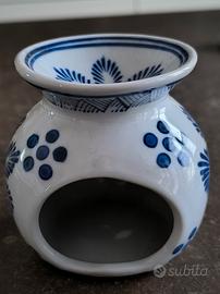 Elegante porta lumino in ceramica con un motivo floreale blu su sfondo bianco.