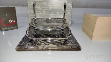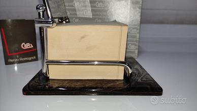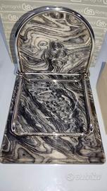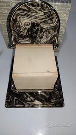 PORTA-MEMO(APPUNTI) in ACETATO DI CELLULOSA effetto MARMORIZZATO con varie SFUMATURE DI GRIGIO - struttura in OTTONE CROMATO finitura LUCIDA - base di appoggio rivestita in PELLE SCAMOSCIATA GRIGIA.