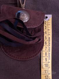 Porta monete, stile vintage, da agganciare alla cintura o dentro una borsa con moschettone, chiusura con bottone automatico, bottone in metallo e lunghe frange decorative. Colore marrone, materiale scamosciato.