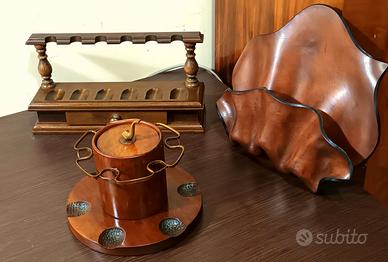 3 eleganti porta pipe vintage degli anni 70, in particolare: 1 portapipe da tavolo 6 posti con cassettino per accessori, dimensioni: lunghezza cm.32 circa, larghezza cm.9 circa, altezza cm.15 circa, peso gr.880 circa, in legno massello di noce---1 porta pipe da tavolo in legno di noce con al centro scatola porta tabacco, 6 posti, particolari in ottone, dimensioni: diametro base cm.20 circa, altezza cm.14 circa, diametro porta tabacco cm.10 circa, peso gr.700 circa---1 porta pipe di cuoio lavorato a mano da parete, 3 posti, dimensioni: altezza cm.27 circa, larghezza cm.31 circa, peso gr.430 circa----, condizioni ottime per tutti, spedizione tracciabile.