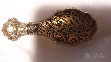 bottiglietta porta profumo in argento dorato cesellato con ampolla in cristallo antico, sicuramente precedente a fine 800, secondo alcuni antiquari potrebbe risalireper le incisioni che porta sul colloalla dinastia estense; stimata a seconda dell'esperto interpellato da 1.500 a 5.000 Euro, probabilmente in asta potrebbe ricavare di più, a richiesta foto particolari