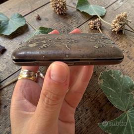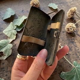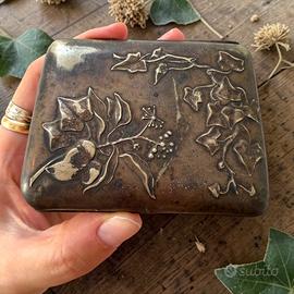 E voi lo sapevate che l’edera nel linguaggio Floriografico dell’Art Nouveau simboleggiava l’amore duraturo e fedele? Vi spiego perché. Se ci pensate l’edera non è una pianta che troviamo sola: la troviamo sempre solo in relazione (simbiotica tra l’altro) con un’altra pianta. Proprio prendendo spunto dalla natura, quindi, l’Art Nouveau ha visto un forte simbolismo in questa pianta associandolo all’indissolubile legame d’amore. Oggi la troviamo rappresentata sia al fronte che a tergo di questo splendido porta sigarette d’epoca risalente alla fine dell’Ottocento o al primo Novecento. Questi oggetti facevano parte della quotidianità di dame e gentiluomini dell’epoca che solevano riporli nella borsetta o nel taschino. L’esemplare che ho trovato per voi conserva ancora gli elastici originali all’interno mediante i quali le sigarette venivano mantenute al proprio posto. C’è una bellissima patina del tempo sulla superficie argentata che non ho rimosso perché la trovo veramente indicativa dell’epoca, chi volesse può comunque procedere ad una lucidatura. Mi piace sottolineare che un oggetto del genere è anche molto versatile, perché chi non lo volesse utilizzare per il suo scopo originario può indubbiamente reinterpretarlo come splendido porta biglietti da visita. E immaginiamoci l’eleganza del presentarsi, estraendo un oggetto simile e di tal fattura, davanti al proprio cliente. Condizioni come da fotografie. Dimensioni centimetri 9 x 6,8.