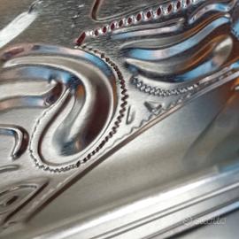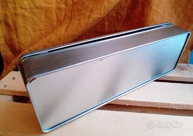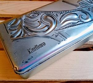 Contenitore vintage marchio Marlboro. Alluminio con decorazione in rilievo. La scatola apre e chiude bene. Segni scuri in alcuni punti. Vedi foto. Condizioni vintage buone.