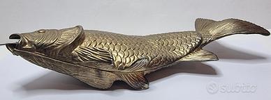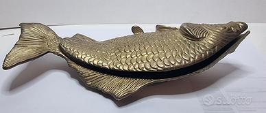 Coppia di pesci decorativi in ottone dal carattere vintage, con splendida lavorazione a rilievo su squame e pinne. Eleganti e originali, possono essere utilizzati come porta tovaglioli, porta lettere o come elemento decorativo di grande effetto.