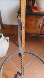 L'oggetto nell'immagine è un portavaso antico in ferro battuto, realizzato con tecnica artigianale di forgiatura a mano. Caratteristiche e Stile Design: Presenta un fusto centrale decorato con elementi floreali, come la rosa visibile al centro, e gambe a treppiede con lavorazione a torciglione. Stile: È riconducibile allo stile Liberty (Art Nouveau), tipico dei primi del Novecento. Uso: Oltre che come portapiante da interno o giardino, strutture simili venivano storicamente utilizzate anche come portacatitino o bracieri.