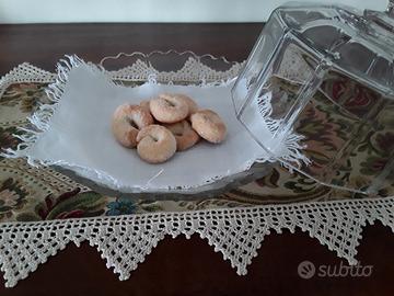 La campana è in cristallo di Boemia mentre il piatto in vetro. La campana ha una forma geometrica , il piatto ha il bordo ondulato.