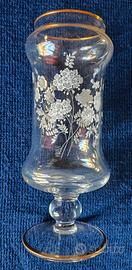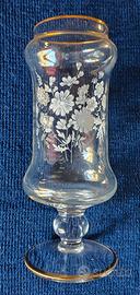 Portacandele in vetro inciso con decorazioni floreali bianche serigrafate e sottili bordi dorati sulla parte superiore e sulla base, risalente anni 60, manifattura Fiorentina o di Murano.