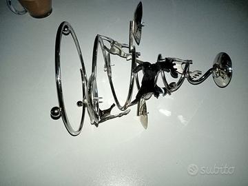 portacandele centrotavola natalizio a forma di albero di Natale stilizzato con 5 portacandele (meglio rotonde) i cinque renne applicate sulla spirale tre piedini sul fondo il tutto in metallo argentato che si pulisce con il prodotto per l'argento