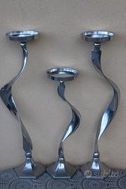 Trittico portacandele Vintage in alluminio. Stile Brutalist. Altezza due grandi 48 cm. Altezza piccolo 36 cm.