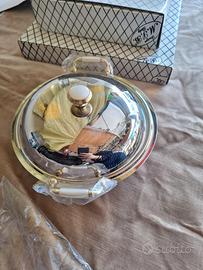 Elegante portacaramelle in acciaio inox con finiture dorate e manici decorativi.