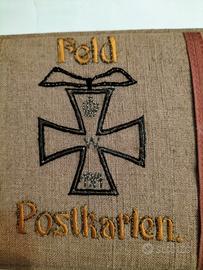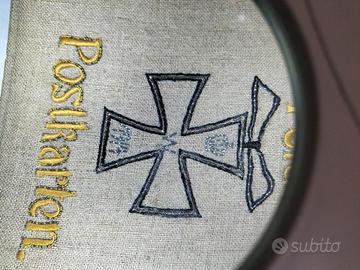 Portacartoline del 1914 in spesso tessuto tipo sacco con ricamata scritta Feld Postkarten e ricamata CROCE DI FERRO al cui interno dall'alto: stemma, W, 1914 Misure cm 20 x 13, pagine 50 x per 100 cartoline, in ogni pagina doppio bordo fessurato x cartolina 14 x 9, normali segni di usura del tempo, solo su 3 pagine breve lieve interruzione incollata inferiormente alle fessure porta-angoli che peraltro sono perfettamente funzionanti. Solo se interessati richiedere altre foto. 3382815536