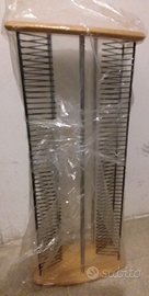 Porta cd o dvd con doppia colonna, vintage, da arredamento, con basi in legno chiaro larghe 33 cm e profonde da 15 cm (ai lati) a 17 cm (al centro). Montanti in tubolare metallico nero.