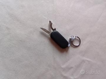 comodo portachiavi in pelle nera con apribottiglie e coltellino multiuso richiudibili, anni 70/80