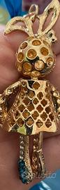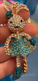Simpatico portachiavi coniglietta con strass bianchi e turchesi e con fiocchetto in raso azzurro. Finitura oro. Dotato di anello portachiavi e moschettone che ne permette l'utilizzo anche come mascotte per la borsa o lo zaino. Altezza cm.14. Nuovo con cartellino, sacchetto nero in tulle e scatolina in latta del brand Camomilla Milano. Ottima idea regalo. π