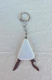 Portachiavi multifunzione bianco triangolare in plastica con apribottiglie e coltellino.