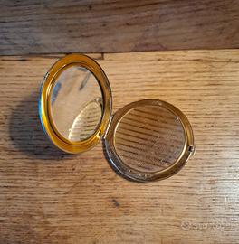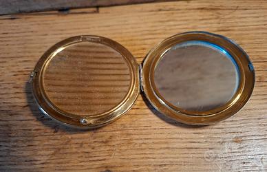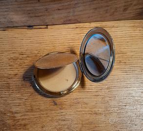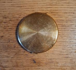 Stupenda e raffinata lavorazione!! Portacipria da borsetta , vintage anni '50 , con delizioso decoro di piccole foglie , realizzata in metallo color oro antico. All'interno specchietto con coperchio decorato per spazio cipria. Con segni di usura dovuti all'età (vedi foto) ma si apre e chiude perfettamente. Nonostante i normali segni del tempo resta un oggetto di particolare fascino!! :)