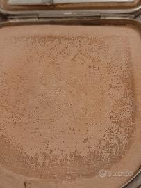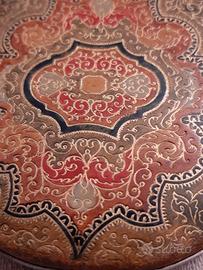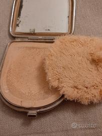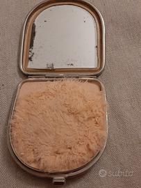 portacipria in pelle lavorata color rosso oro nero, retro verde scuro al suo interno specchietto con segni del tempo su un lato cipria e piumino originale anni 50