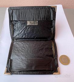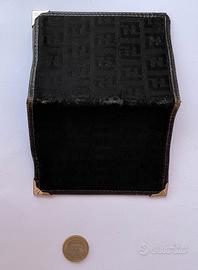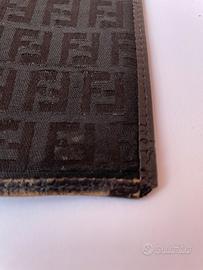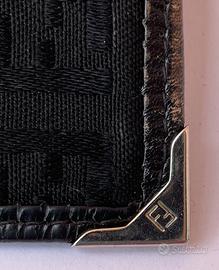 Raro accessorio, Fendi S.A.S. originale vintage anni ’70 (produzione storica pre-anni '80) Portadocumenti nero, sottile, con due scomparti a fessura Esterno in tessuto jacquard (canvas), con profili in pelle, caratterizzato dall’iconico motivo a monogramma “Zucca” di Fendi, con loghi “FF” intrecciati, firmato da Karl Lagerfeld nel 1965 Interno in pelle martellata, con impresso logo in oro "FENDI S.A.S. Roma - Made in Italy" molto nitido, perfettamente leggibile e fodera a costine tipica del periodo Angoli metallici originali con logo Fendi inciso, ben leggibile, con doratura ancora lucida, senza graffi profondi o ossidazione verde (un angolo mancante) Come mostrato nelle foto, segni di usura coerenti con l'età (oltre 40 anni), alcuni punti di scollamento interno, screpolature e usura sui profili, il tessuto esterno è usurato sul punto di piega, e manca uno dei quattro angoli metallici protettivi, ma ideale per collezionisti d'archivio o come set di ricambi originali per restauro conservativo Colore: Nero Misure: 11,5 cm x 8,5 cm (spessore 0,5 cm) Peso: 30 grammi Materiale: Pelle, Metallo, Cotone e Sintetico (poliestere o nylon) Marca: Fendi S.A.S. Made in Italy