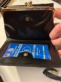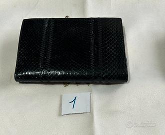 1) Portafoglio da donna , vintage ,in vera pelle di pitone nera esternamente mentre , l’interno è rifinito con un doppio portamonete e molti scomparti, in morbida pelle, nuovo.