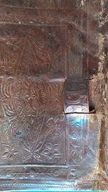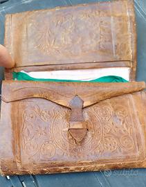 come da foto si tratta di un portafoglio in pelle molto elegante e con delle raffigurazioni una donna che lavora al telaio se non sbaglio raffigura un momento di caccia l'altro si vede un leone sdraiato e vicino sembra una antiope al suo fianco un altro animale africano che non conosco all'interno e foderato con una tela verde sembra seta come si nota e grande si piega due volte a un numero 956 che dovrebbe essere l'anno Chi sa dirmi qualcosa in più ringrazio anticipatamente un restauro sarebbe una cosa giusta da fare per vedere meglio tutte le storie che racconta ogni raffigurazione/ se qualcuno è interessato può farmi un'offerta che sia il valore che merita solo io lo conservo da 50 anni vi saluto