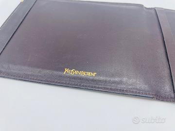 Porta banconote Yves Saint Laurent (YSL) in pelle marrone, stile classico, con logo YSL impresso e angoli rinforzati in metallo dorato. Cm 15x11,5 h chiuso – 30x11,5 h aperto. Venduto senza