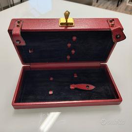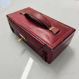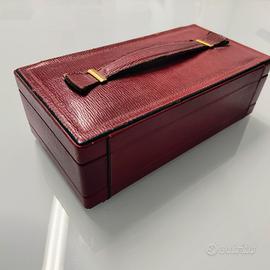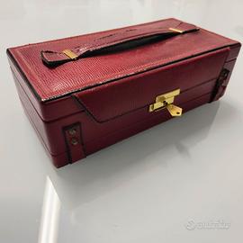 Portagioie Beauty vintage in pelle bordeaux e alcantara nera con chiave, specchio e doppio scomparto.
