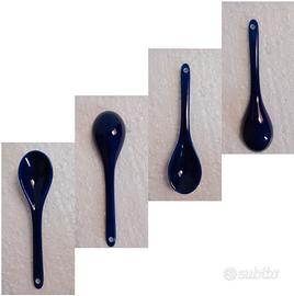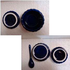Portagioie blu Compreso di coperchio è alto 5,5 cm Diametro del coperchio è 8,3 cm Diametro della scodellina complessiva considerando anche il bordo più esterno 8,7 cm Diametro della circonferenza più interna della scodellina 7 cm Il cucchiaio è lungo 12 cm