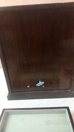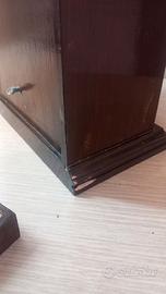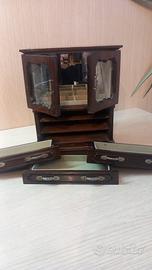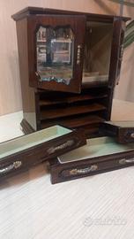 Piccolo carillon porta gioie in legno con finitura scura, dotato di due ante frontali con vetro decorato e tre cassetti inferiori con maniglie in metallo. All’interno presenta scomparti per anelli e piccoli gioielli. Stile classico ed elegante, ideale come oggetto da collezione o regalo. Ltezza 25cm profondità 11cm largo 21cm Sbeccato ad un lato per usura.