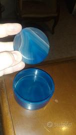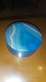 elegante scatola portagioie realizzata in agata blu brasiliana. valorizza il tuo spazio con questa squisita scatola rotonda in agata realizzata a mano, perfetta per conservare gioielli, ricordi o piccoli tesori. la pietra preziosa blu reale è splendidamente lucidata. Materiale: agata brasiliana autentica con motivi naturali Forma: rotonda con coperchio abbinato Interno: rivestimento interno liscio. Colore: blu intenso con venature di pirite. Artigianato: fatto a mano da abili artigiani brasiliani Peso: gr200