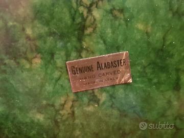 Cofanetto portagioie in alabastro certificato, prodotto in Italia negli anni ’60. Bordature e piedini in ottone. Le venature e i piccoli punti bianchi non sono imperfezioni ma segni propri dell’alabastro. Un solo minuscolo difetto nella parte sinistra del coperchio (1 mm), invisibile e rintracciabile solo al tatto. .L’oggetto è in ottime condizioni. Misure : h. 8,5 – 12 x 15,5 circa