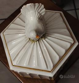 realizzato artigianalmente in Italia negli Anni ’70.Pezzo numerato e rifinito con bordature color oro. Il coperchio è decorato con una scultura di colombo in ceramica, che funge da pratico pomello.