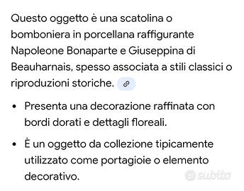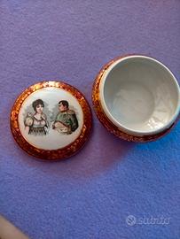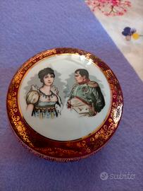 BELLISSIMO PORTAGIOIE CONTENITORE IN PORCELLANA, CON BORDI IN ORO ZECCHINO, DA COLLEZIONE, FRANCESE, CON MARCHIO ORIGINALE " PORCELAIN DE LUXE " ANNI 50/60, RAFFIGURANTE NAPOLEONE BONAPARTE E GIUSEPPINA DI BEAUHARNAIS. IN OTTIME CONDIZIONI, COME NUOVO.