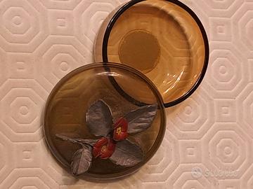 Elegante e raffinata scatolina decorativa vintage (anni ’60-’70), ideale come portagioie o svuota-tasche da toeletta. Realizzata in resina acrilica rigida con una calda tonalità ambrata che richiama lo stile Mid-Century. Il coperchio è impreziosito da un dettaglio artistico in rilievo: un ramo fiorito in peltro finemente lavorato, con petali smaltati in rosso vibrante e foglie dalle venature realistiche. Un pezzo di design retrò che aggiunge un tocco di classe a qualsiasi ambiente. Made in Italy, cesellato a mano. Misure: diametro 5.5cm, altezza 2.5 cm. Prezzo trattabile.