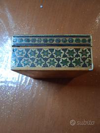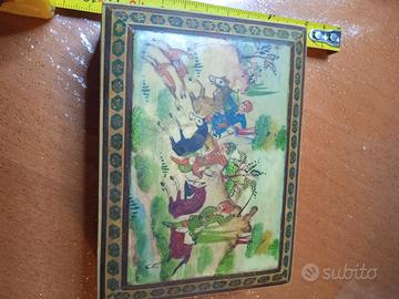 Scatolina persiana realizzata con la tecnica Khatam,con microintarsi in legno e osso,in buone condizioni, raffigurante scena di caccia. Misure 11x8x4 cm