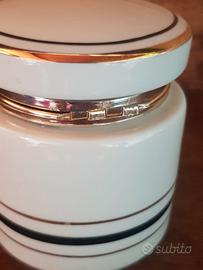 Portagioie in porcellana di Limoges dipinto a mano con motivi floreali e dettagli dorati. Realizzato in Francia negli anni ’80, reca impresso sul fondo “Peint à la main – Limoges”. Con cerniera in metallo sagomato.