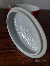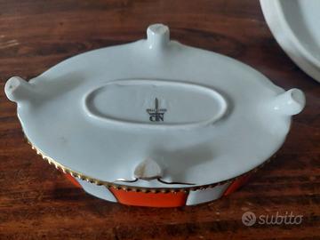 Realizzato in porcellana bianca dipinta a mano con finiture in oro con decorazione a strisce arancione e bianco.