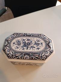 Scatola decorativa in ceramica con design esagonale, spesso utilizzata come elemento decorativo o piccolo portagioie