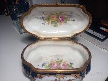 Prezioso cofanetto portagioie in porcellana Luigi XV (1764), blu cobalto e oro, con coperchio a cerniera, firmato e marchiato.