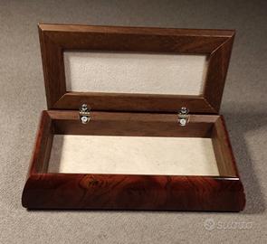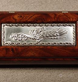 Portagioie realizzata in legno di radica con una applicazione frontale in lamina d'argento 925 che raffigura un drago con spighe di grano .